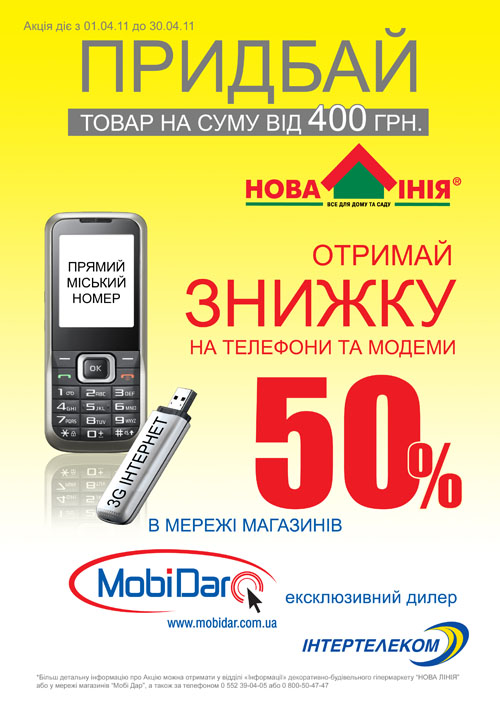 С 01.04 по 30.04.2011 приходите в «Новую Линию» в Херсоне, совершайте покупку любой продукции, представленной в гипермаркете на сумму от 400 грн, предъявите чек в сети магазинов «Моби Дар» и получите скидку 50% оборудование (телефоны и модемы CDMA-формата) в сети магазинов «Моби Дар».