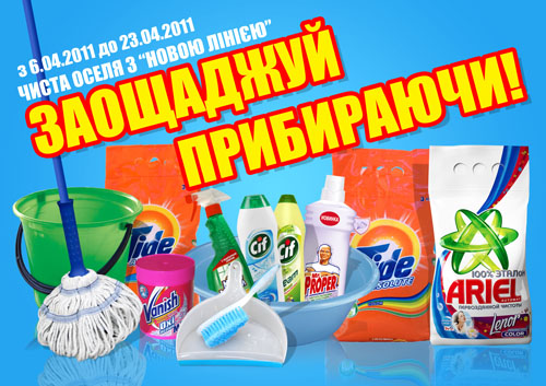 В период с 6 апреля 2011 года до 23 апреля 2011года ищите ценники со специальной ценой на товары для уборки в отделе Хозяйственные товары во всех гипермаркетах «Новая Линия»! Средства для мытья, щетки, порошки, перчатки, швабры и все-все для чистоты и блеска Вашего дома по специальным ценам! Только в апреле, и только в «Новой Линии»!
