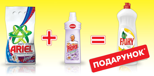 Условия акции просты: с 04.04.2011 по 01.06.2011 совершите покупку любого стирального порошка «Ариель» 3 кг и любого средства для мытья «Мистер Пропер» 750 мл, в одном чеке, и гарантированно получите подарок - средство для мытья посуды «Фейри» 1 л.