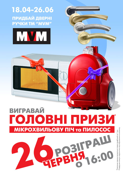 С 18.04.2011 по 26.06.2011 года совершите покупку от 3-х ручек для дверей ТМ «МВМ» в одном чеке, и гарантировано получите подарок от ТМ «МВМ». Ручки, брелоки-рулетки и чашки уже ждут Вас!