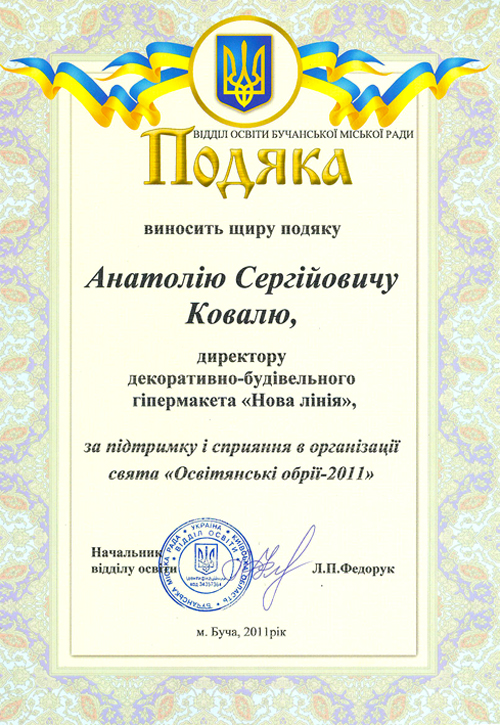 25 мая уже второй год подряд национальная сеть декоративно-строительных гипермаркетов «Новая Линия» выступает в роли спонсора "Освітянських обріїв", мероприятия, организованого отделом образования Бучанского Городского Совета, с целью награждения подарками и грамотами лучших учеников, победителей олимпиад, творческих конкурсов и спортивных мероприятий.