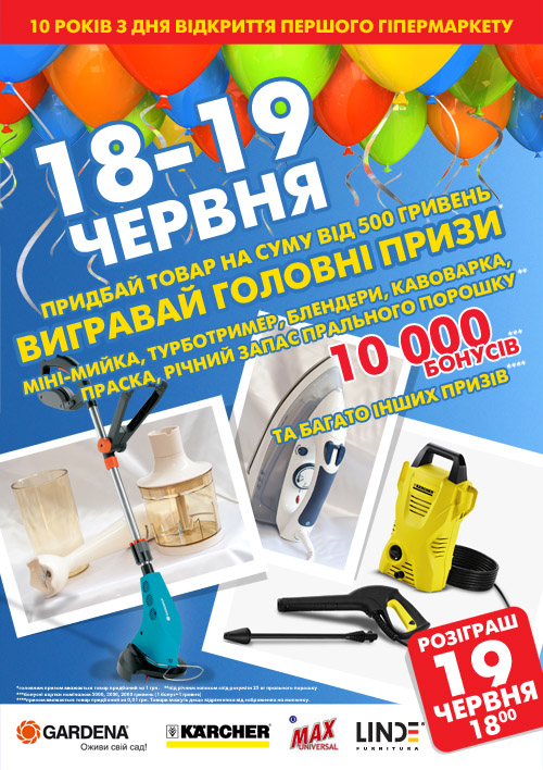 Если же Вы совершите покупку 18 и 19 июня на сумму от 500 грн одним чеком, у Вас есть уникальная возможность выиграть один из главных призов. 10 000 грн на бонусную карточку, минимойки, триммеры для Вашей дачи, мелкая бытовая техника, годовые запасы стирального порошка и много других ценных призов могут стать Вашими!