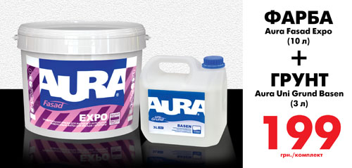 При покупке Краски Fasad Expo 10л и Грунта Unigrund Basen 3л ТМ «AURA» Вы оплачиваете, как за комплект – всего 199 грн. Небывалая экономия!
