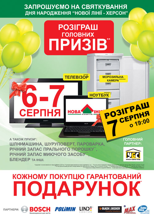 6 и 7 августа ждем Вас в гипермаркете «Новая Линия» Херсон! Подарки каждому покупателю, конкурсы, веселье, удачные покупки и, конечно же, розыгрыш главных призов ждет Вас в эти праздничные выходные!