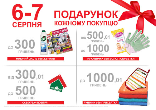 Каждый покупатель, который с 6.08 по 7.08 совершит покупку на сумму от 500 грн в одном чеке гарантированно принимает участие в розыгрыше ценных и незаменимых по дому призов. Морозильная камера, телевизор, современный ноутбук, шлифмашина, пароварка, блендер и много других подарков могут стать Вашими. Просто заполните анкету, опустите ее в лототрон, приходите на розыгрыш и удача обязательно улыбнется именно Вам!