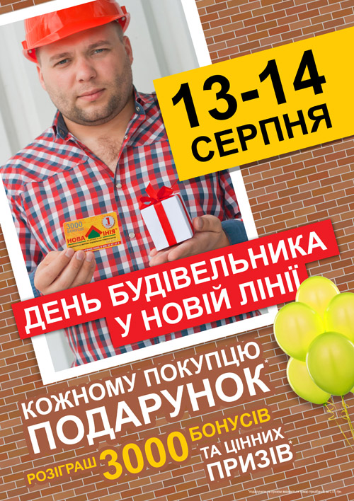 В честь праздника Дня Строителя «Новая Линия» подготовила для вас много сюрпризов подарков и призов, уважаемые покупатели.