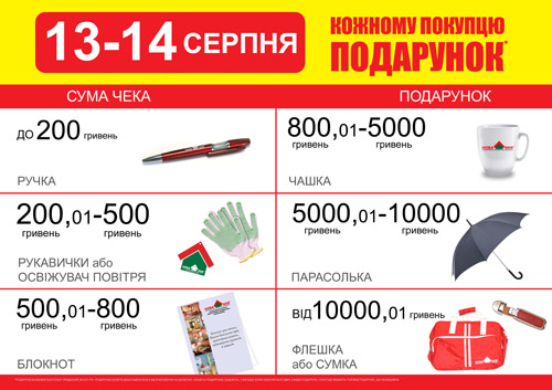 Каждый покупатель, который совершит покупку 13 и 14 августа на сумму от 500 грн в одном чеке, гарантированно принимает участие в Розыгрыше ценных подарков. Годовые запасы стирального порошка, средства для мытья посуды, стулья для пикника и Главные призы - 1 000 и 2 000 бонусов на Вашу бонусную карточку уже ждут Вас!