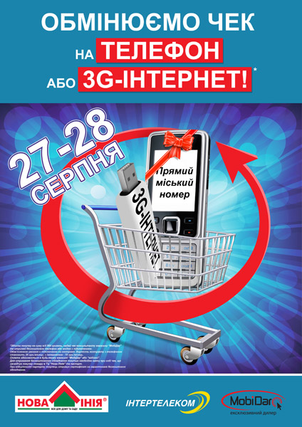 Уважаемые покупатели! С 27 августа по 28 августа 2011 года в гипермаркете «Новая Линия» Херсон пройдет увлекательная акция совместно с ТМ «Моби дар»! У вас есть возможность получить бесплатно телефон или же модем с подключением к интернету!