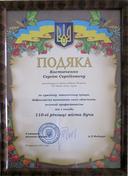 А также было отмечено благодарностью Костюченко Сергея Сергеевича - менеджера по продажам отдела «Плитка» ТЦ «Новая линия» г. Буча - за добросовестный настойчивый труд, добросовестное выполнение своих обязанностей и высокий профессионализм.