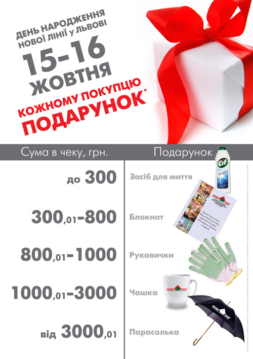 15 и 16 октября сделайте покупку в гипермаркете «Новая Линия» Львов - и ГАРАНТИРОВАНО получите подарок! Фирменные блокноты, перчатки, зонтики и многие другие подарки уже ждут Вас!