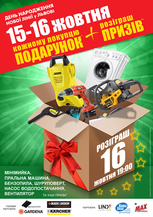 15 и 16 октября, каждый покупатель, который совершит покупку на сумму от 500 грн в одном чеке, гарантировано принимает участие в розыгрыше главных призов – современной стиральной машины, бензопилы, шуруповерта, вентилятора и многих других ценных подарков!