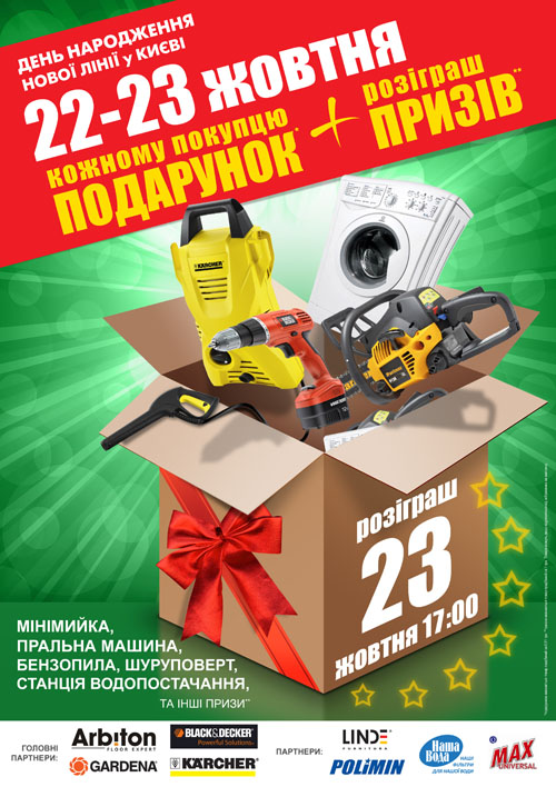 Если же Вы 22 или 23 октября совершите покупку в гипермаркете «Новая Линия» на О. де Бальзака на сумму от 500 грн одним чеком, у Вас есть возможность принять участие в розыгрыше главных призов и выиграть стиральную машину, минимойку, бензопилу, шуруповерт и много других ценных и полезных подарков!