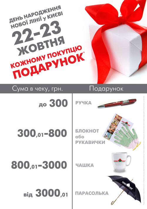 22 и 23 октября сделайте любую покупку в гипермаркете «Новая Линия» на О. де Бальзака и ГАРАНТИРОВАНО получите подарок! Фирменные ручки, блокноты, чашки и зонты ждут каждого покупателя «Новой Линии»!