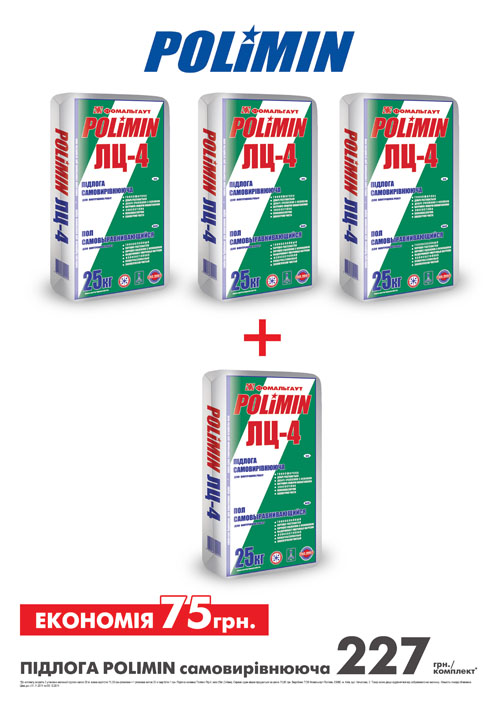 C 01 ноября по 5 декабря в сети гипермаркетов «Новая Линия» при покупке 4-х мешков сухих смесей «Наливной пол ЛЦ-4» (25кг) ТМ «Полимин», Вы оплачиваете стоимость всего 3-х мешков! Экономия на ремонте! 4 мешка сухих смесей по цене всего 3-х!