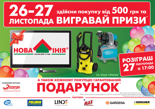 26 и 27 ноября приходите в гипермаркет «Новая Линия» в Харькове, делайте покупки на сумму от 500 грн и участвуйте в розыгрыше ценных призов. Современный телевизор, бензопила, минимойка, блендер и много других призов и подарков ждут Вас!