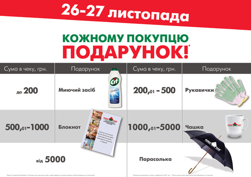 26 и 27 ноября сделайте любую покупку в гипермаркете «Новая Линия» в Харькове и ГАРАНТИРОВАНО получите подарок! Фирменные блокноты, чашки рукавички и зонты ждут каждого покупателя «Новой Линии» 26 и 27 ноября!