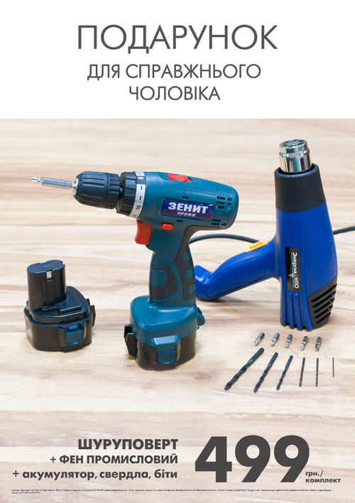 Прислушиваясь к каждому покупателю, и постоянно находясь в поисках лучших предложений высококачественных товаров по доступным ценам, национальная сеть декоративно-строительных гипермаркетов «Новая Линия» предлагает Вам уникальное ценовое предложение – шуруповерт с аккумулятором, наборами бит и сверел, а также промышленный фен в подарок – по цене всего 499 грн за комплект.