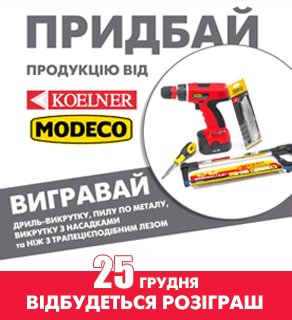 С 20.12.2011 по 17-30 25.12.2011 каждый покупатель продукции ТМ «Koelner» или ТМ «Modeco»» на любую сумму, принимает участие в розыгрыше призов от ТМ «Koelner» и ТМ «Modeco»». Получите в подарок Отвертку с насадками, нож с трапециевидным лезвием или же пилу по металлу и любой ремонт будет Вам под силу!