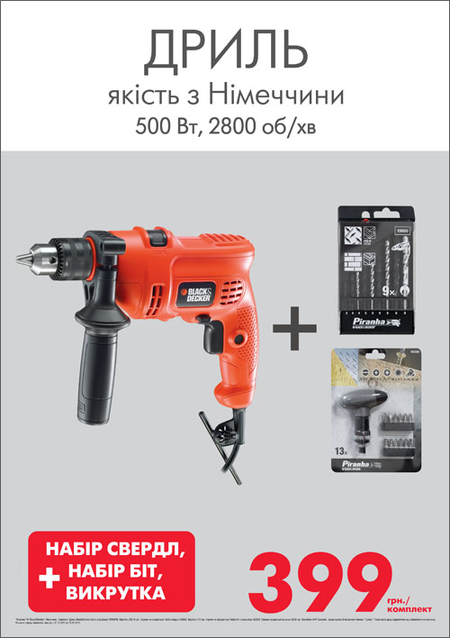 Национальная сеть декоративно-строительных гипермаркетов «Новая Линия» предлагает Вам ознакомиться с уникальным предложением, и приобрести дрель по суперцене – всего 399 грн за комплект. В комплект входит набор сверел, набор бит и отвертка. Такой набор обязательно придется по душе настоящему хозяину, и сделает работы по дому легкими и непринужденными.