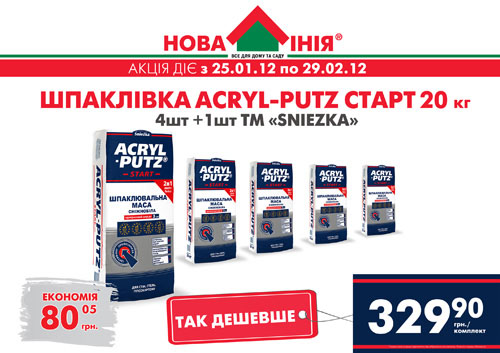 С 25 января по 29 февраля 2012 года во всех гипермаркетах «Новая Линия» при покупке комплекта шпаклевки Acryl-Putz старт 20кг (5шт) от ТМ «Снежка» вы платите сниженную цену - 329,90 грн за комплект!