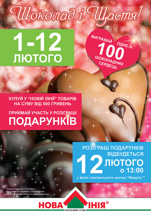 В период с 1 февраля по 12 февраля 2012 года при покупке товаров в «Новой Линии» Буча на сумму от 500 грн, Вы гарантированно принимаете участие в розыгрыше призов от ТЦ «Модуль».