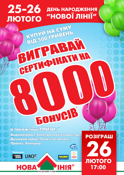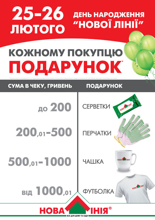 25 и 26 февраля «Новая Линия» приглашает всех на празднование дня рождения! В программе – покупки для дома, сада и ремонта, мастер-классы, увлекательные конкурсы и подарки каждому покупателю.