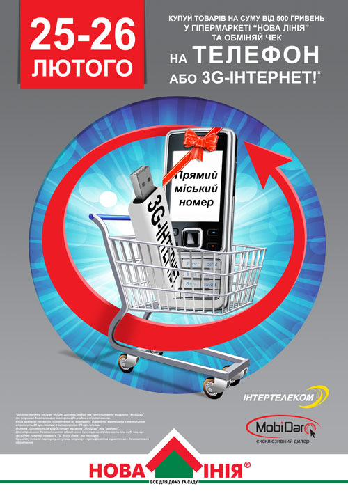 25 и 26 февраля при покупке товаров в "Новой Линии" Херсон на сумму от 500 грн у Вас есть возможность получить в подарок телефон или 3G - Интернет от сети магазинов МобиДар!