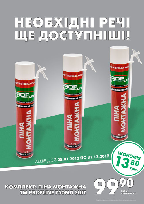 При покупке трех упаковок монтажной пены «Profline», 750 мл, Вы оплачиваете за них сниженную цену - всего 99,90 грн.