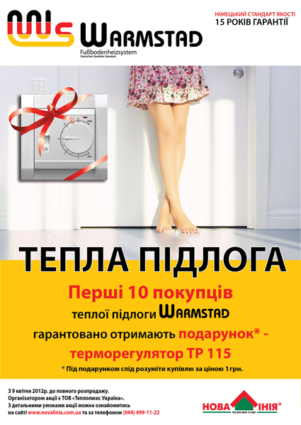 С 6 апреля по 6 мая первые 10 покупателей, которые приобретут комплект нагревательных матов или секций «WarmStadt» получают возможность приобрести Терморегулятор ТР 115 всего за 1,00грн.! Количество акционного товара ограничено!