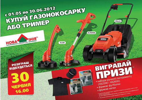 При покупке триммера «BLACK&DECKER GL250», триммера «BLACK&DECKER GL4525SB» или газонокосилки «BLACK&DECKER E Max32» Вы гарантированно принимаете участие в розыгрыше ценных призов и подарков!