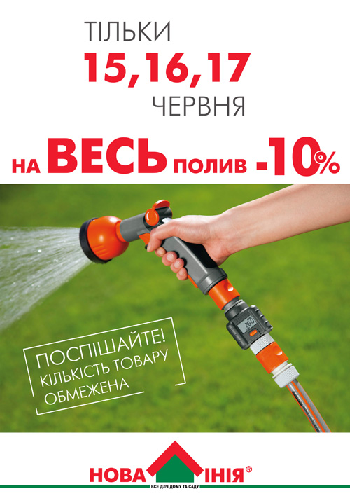 Только до 17 июня и только в национальной сети декоративно-строительных гипермаркетов «Новая Линия» действует скидка 10% на все товары для полива. Инструменты для полива, шланги и многое другое со скидкой 10% вы можете приобрести во всех гипермаркетах сети «Новая Линия».
