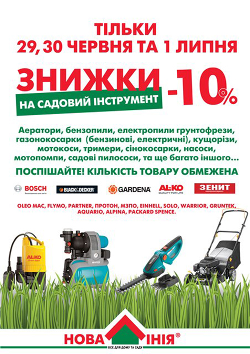 Уважаемые покупатели! В период с 29 июня по 1 июля у вас есть уникальная возможность приобрести приобрести садовый инструмент со скидкой в 10%!