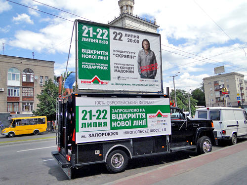 Большое количество покупателей со всего города привлек наш бренд-мобиль, который колесил в течении всего светового дня по самым оживленным улицам г.Запорожья, ведь, мы хотели чтобы как можно больше запорожчан и гостей города посетили наш обновленный гипермаркет "Новая Линия" !