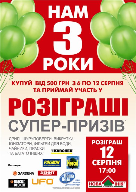 В честь этого знаменательного события уже сейчас всех покупателей гипермаркета "Новая Линия" ждет замечательная акция - все покупатели, которые совершат покупку от 500 грн., получат возможность выиграть огромное количество замечательных призов. Дрели, шуруповерты, ионизаторы, фильтры для воды и другие замечательные подарки будут ждать своих владельцев на главном розыгрыше, который будет проводиться 12 августа в 17:00.