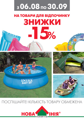 Только до 30 сентября и только в национальной сети декоративно-строительных гипермаркетов «Новая Линия» действует фантастическая скидка 15% на все товары для пляжного отдыха и бассейны. Лодки, матрацы, круги, мячи и многое другое для незабываемого пляжного отдыха со скидкой 15% вы можете приобрести во всех гипермаркетах сети «Новая Линия».