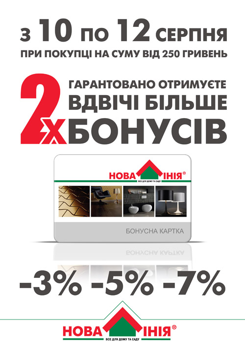 Уважаемые покупатели! С 10 по 12 августа во всех наших гипермаркетах "Новая Линия" (кроме "Новая Линия" Херсон) при покупке товаров от 250 грн., вы гарантированно получаете в 2 раза больше бонусов на свою бонусную карту!