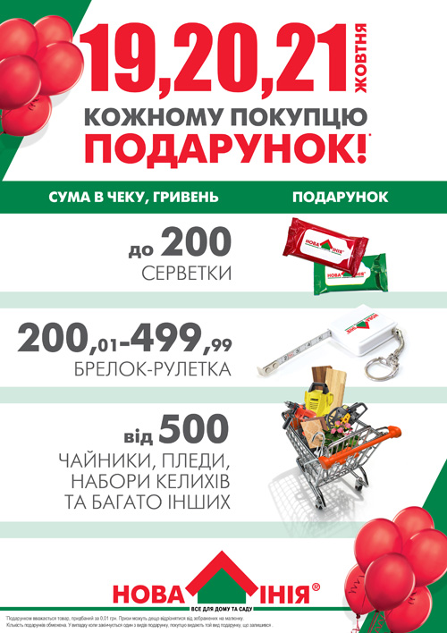 19, 20, 21 октября все покупатели нашего гипермаркета "Новая Линия" гарантированно получат подарок, в зависимости от суммы своего чека! Салфетки, рулетки, пледы, чайники, наборы бокалов и многое другое ждут всех наших покупателей гипермаркета "Новая Линия" Троещина !