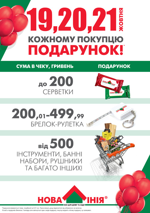 19, 20, 21 октября сделайте покупку в гипермаркете «Новая Линия» Львов - и гарантированно получите подарок! Салфетки, рулетки, пледы, чайники, наборы бокалов и многое другое ждут всех наших покупателей гипермаркета "Новая Линия" Львов !