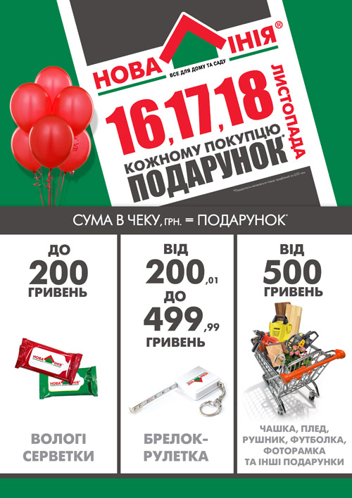 16,17 и 18 ноября совершайте покупки в гипермаркете «Новая Линия» Харьков и гарантированно получите подарок! Салфетки, рулетки, чашки, пледы, чайники, фоторамки и многое другое ждут всех наших покупателей гипермаркета "Новая Линия" Харьков !