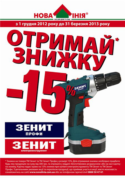 Приобретайте любые товары на сумму от 300 грн., и получайте 15% скидочную карточку на весь новый электроинструмент ТМ "Зенит Профи" !