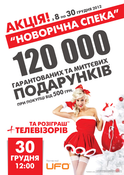 С 8 по 30 декабря, во всех наших гипермаркетах приобретайте любые товары на сумму от 500 грн., и принимайте участие в моментальном розыгрыше ценных подарков ( банные наборы, новогодние украшения, пиротехника, сани, шуруповерты и многое другое) и гарантированно принимайте участие в финальном розыгрыше телевизора и обогревателя!