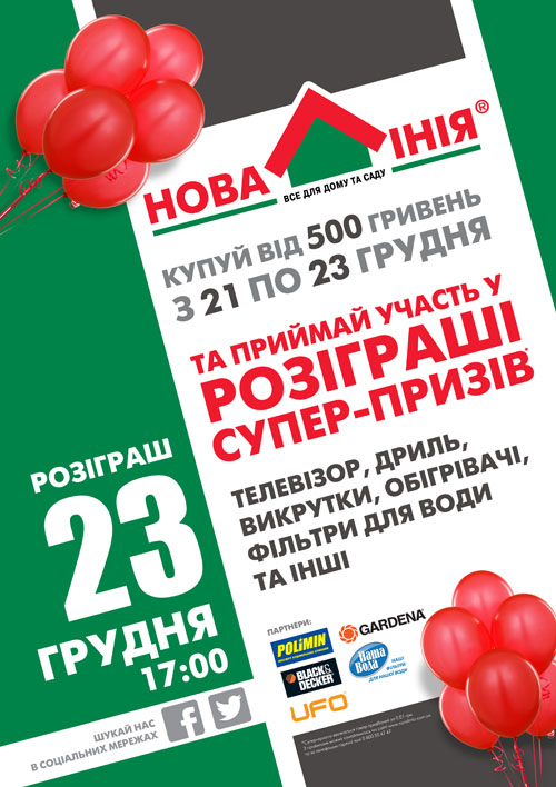 И, наконец, все покупатели, которые в течение трех праздничных дней совершат покупку от 500 грн,, автоматически становятся участниками розыгрыша супер-призов от "Новой Линии", среди которых - дрели, обогреватели, фильтры для воды и многое другое!
