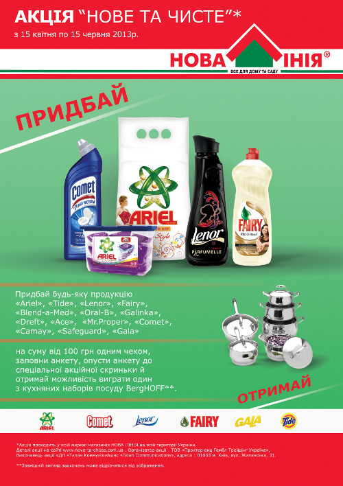 с 15 апреля по 15 июня 2013 года, при покупке любых товаров торговой марки "Procter & Gamble", на сумму от 100 грн., одним чеком, у вас есть возможность выиграть один из кухонных наборов посуды "BergHOFF". Для участия в розыгрыше, вам необходимо будет заполнить анкету.