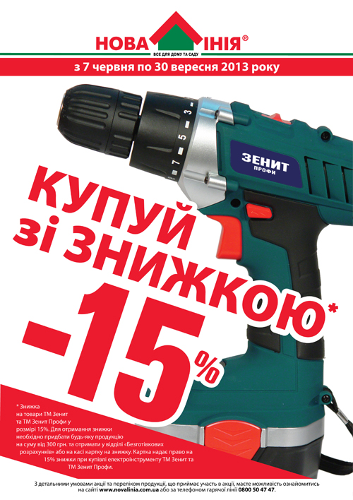 С 7 июня по 30 сентября у вас есть возможность получить -15% скидки на покупку электроинструментов ТМ "Зенит" и ТМ "Зенит Профи".