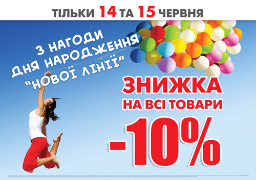 Приходите в любой из 16 гипермаркетов "Новая Линия" и получите -10% скидки на весь ассортимент* товаров!
