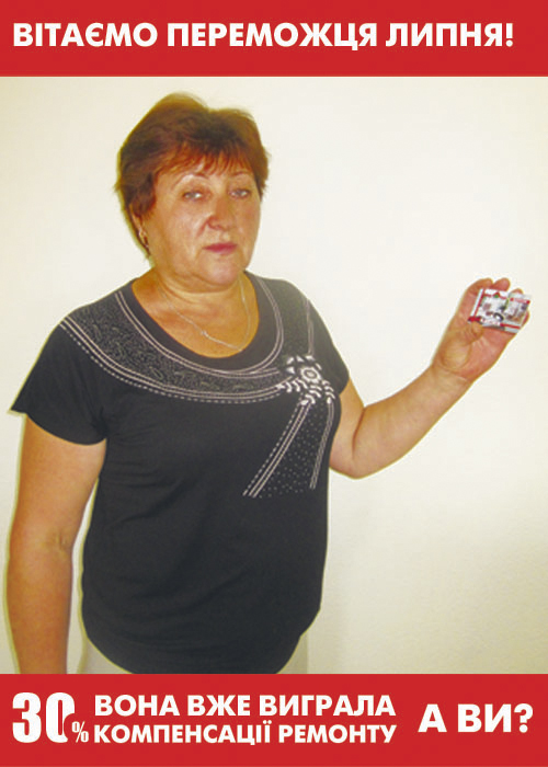 Среди всех зарегистрированных участников на официальном сайте акции - remont.nl.ua, за июль 2013 года, самым удачливым оказалась Губарева Мария, которая выиграла 30% компенсации своих трат на ремонт! Поздравляем победительницу и желаем ей приятных покупок в наших гипермаркетах!