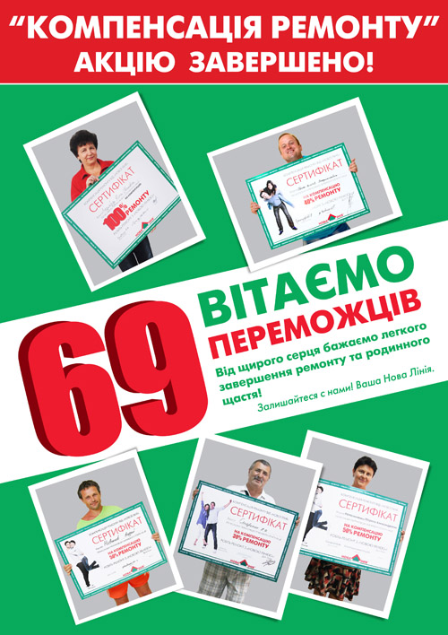 Поприветствуем всех участников и победителей, которые с 1 мая по 31 августа совершали покупки в гипермаркетах "Новая Линия", и получали возможность выиграть 30%, 40%, 50% и 100% компенсации своего ремонта!