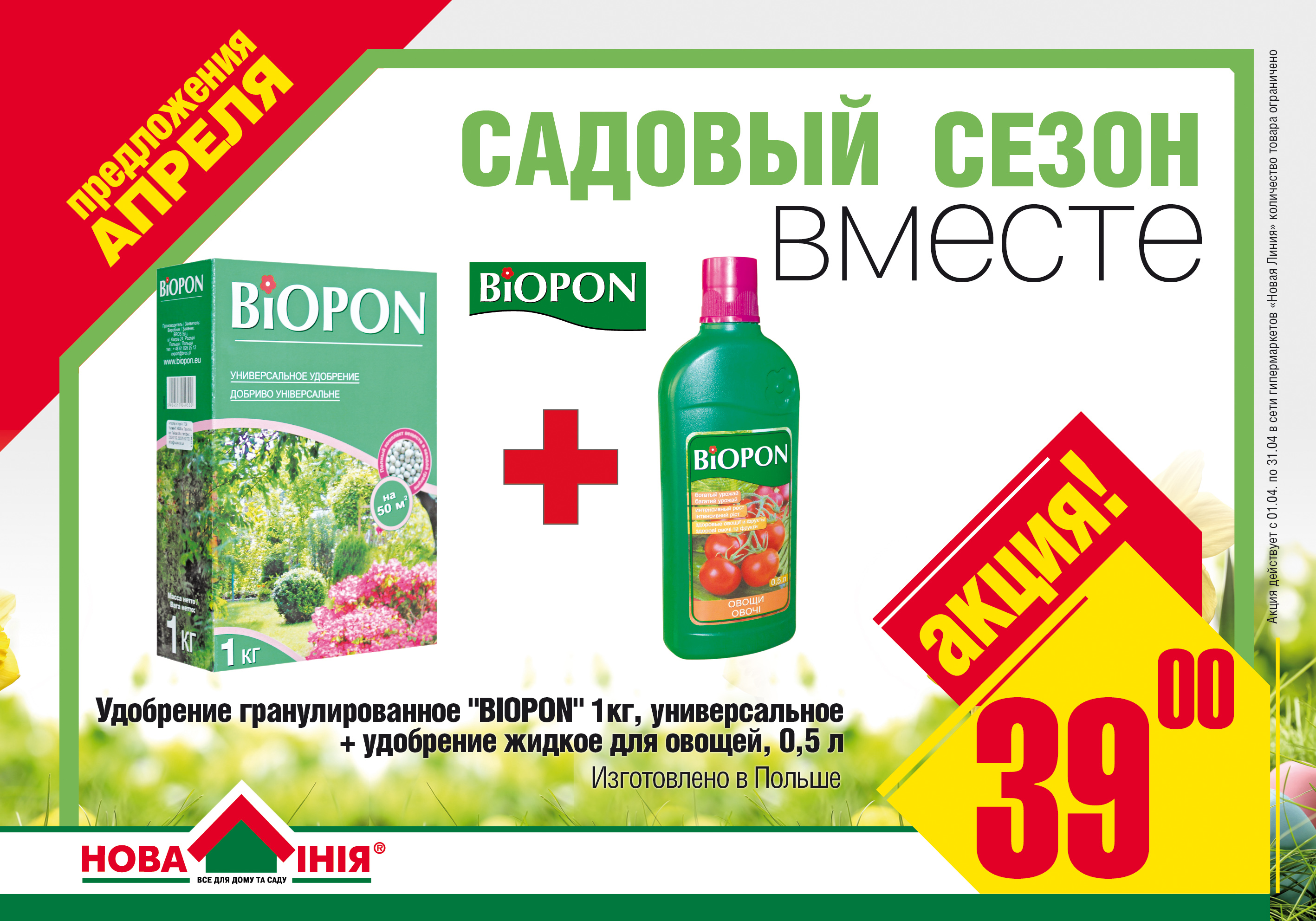 1 кг. гранулированного удобрения BIOPON и 0,5 л. жидкого удобрения для овощей всего за 39 грн.