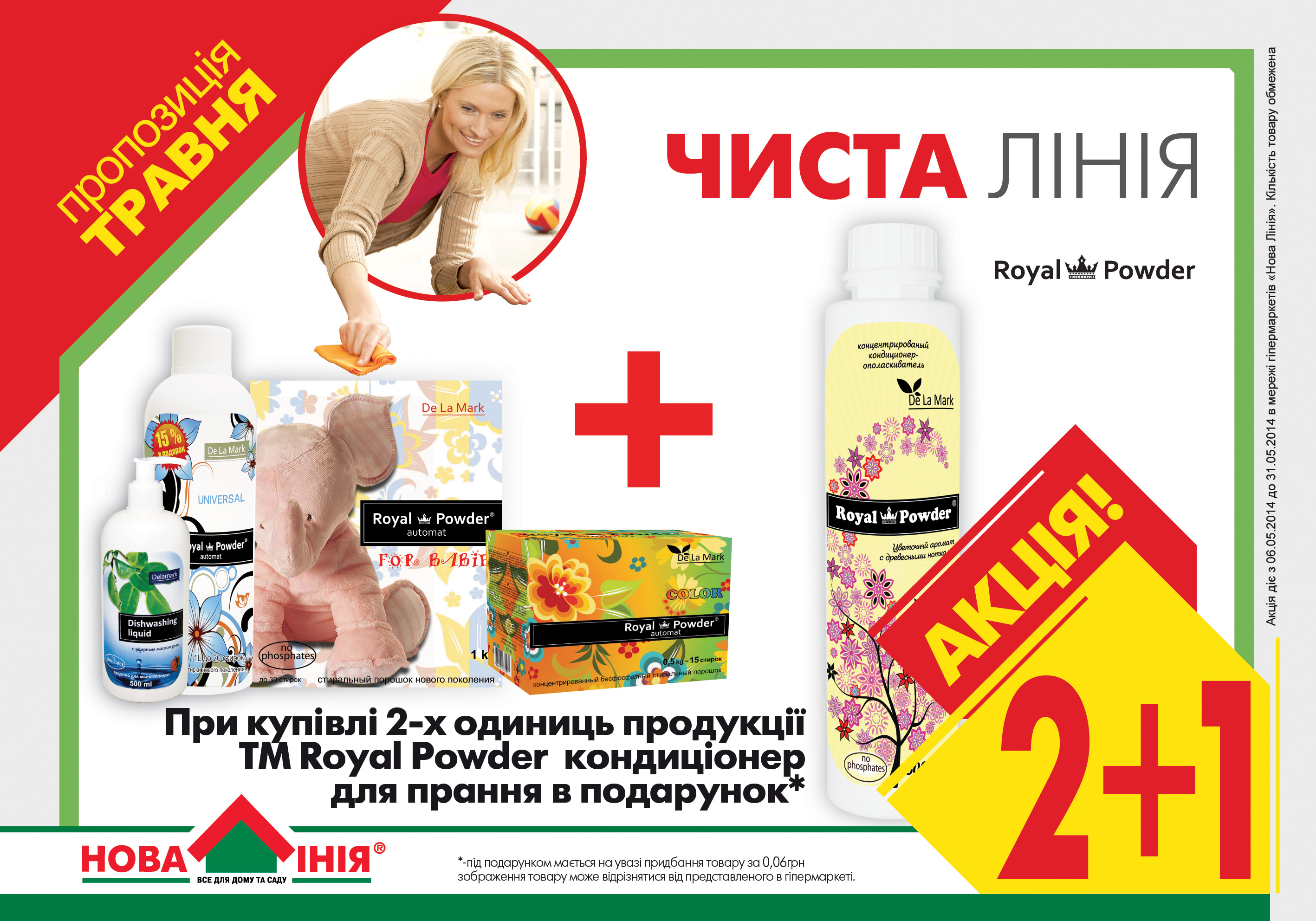 Только в сети "Новая Линия" вы можете приобрести две единицы продукции ТМ Royal Powder и получить кондиционер для стирки в качестве бонуса. Акция действует до 31.05.14.