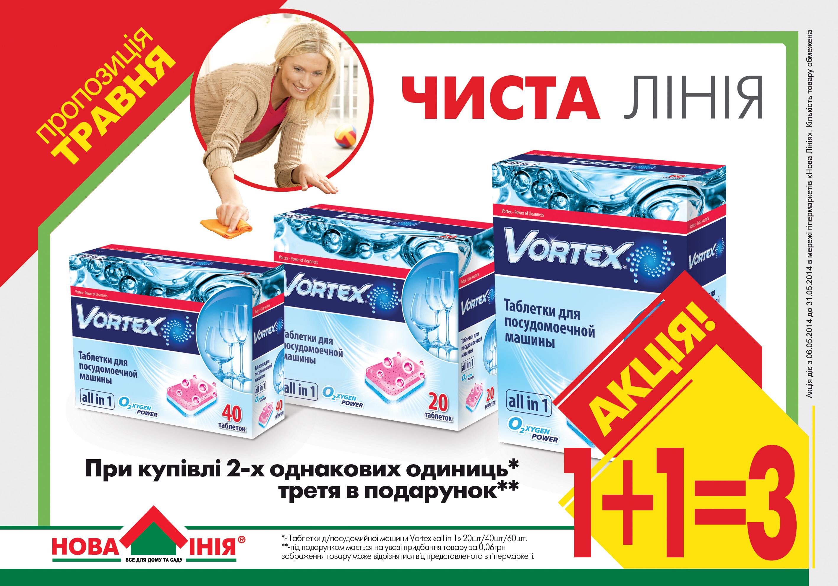 Также при покупке двух упаковок таблеток для посудомоечной машины от ТМ Vortex, вы получаете третью в качестве бонуса. Внимание! Акция действует до 31.05.14